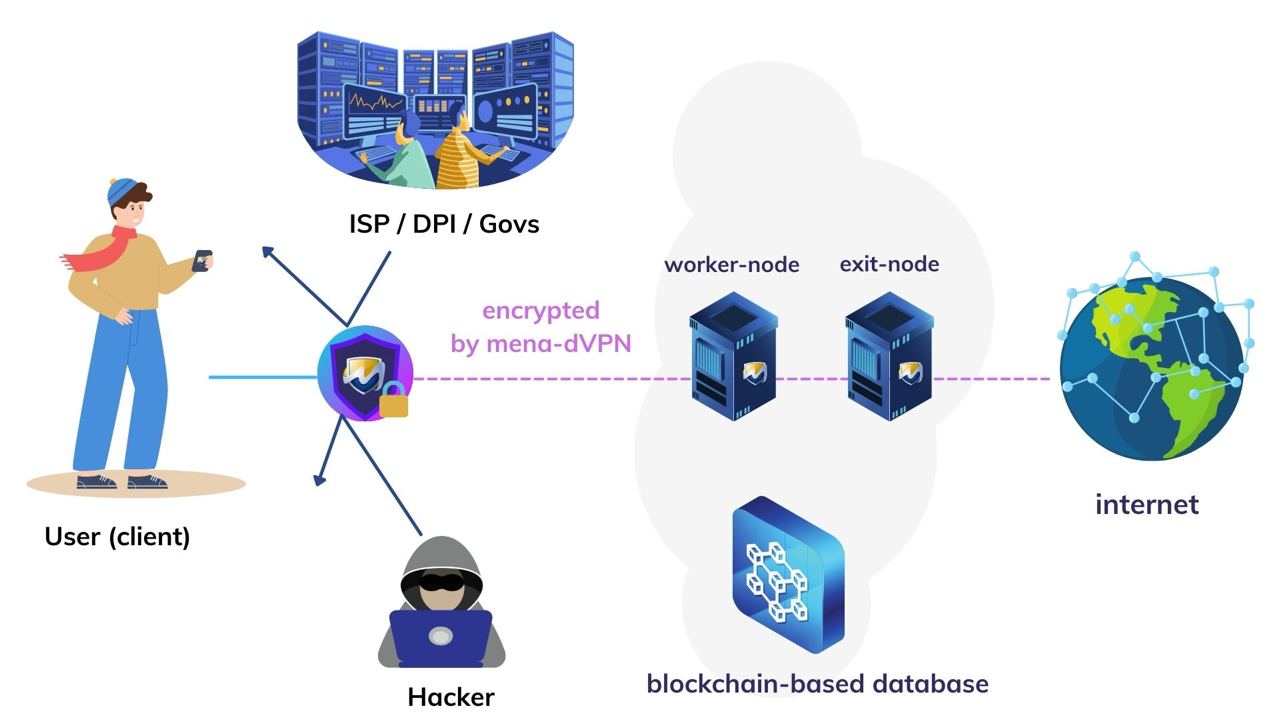 Mena-dVPN offers a secure internet connection that is run by a network of nodes. To understand how safe a dVPN is, it is important to understand the blockchain technology on which it is based. A blockchain is a series of blocks that record data in hash functions with timestamps so that the data cannot be changed or tampered with. The data is secured by eliminating centralized points which are often the target of cyberattacks. In fact, blockchain can store any type of data in publicly available databases, and therefore a Mena-dVPN does not rely on a single central server. so nodes are randomly selected as well as data will be encrypted.